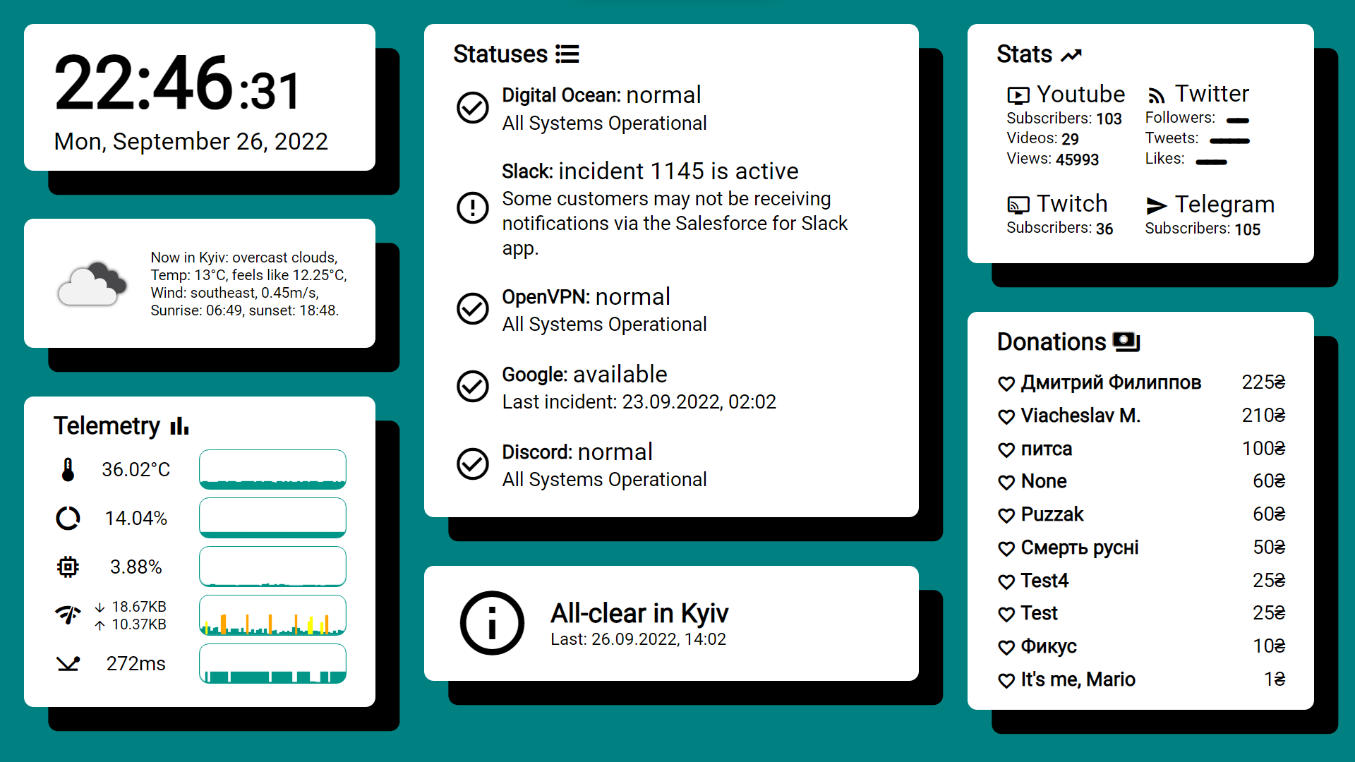 All the data I have - free to everyone, statuses, alerts, statistics, donations, telemetry, weather, etc.