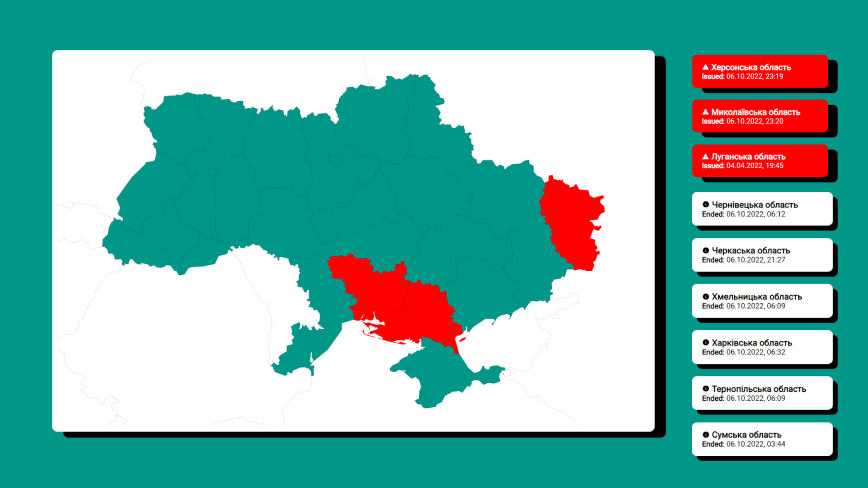 Real time Ukraine air raid alerts map by regions, built with Google Charts API & єМапа API.